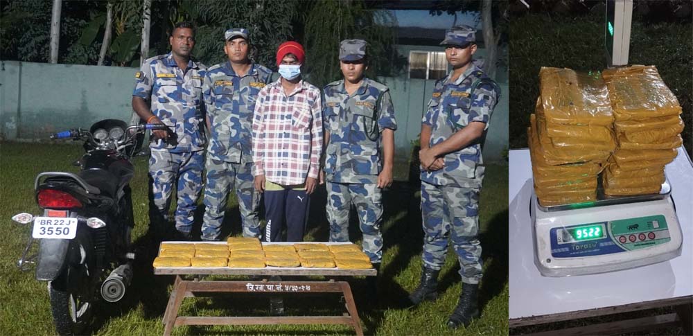 वीरगंज, १४ असोज । सशस्त्र प्रहरी पर्साले साढे ९ किलो चरेससहित एकजना भारतीय नागरिकलाई पक्राउ गरेको छ । असोज १३ गते सशस्त्र प्रहरी बल नेपाल नं. १३ गण पर्साबाट स.प्र.स.नि. नितेश कुमार साह कानुको कमाण्डमा खटिएको ७ जनाको मोबाइल टोलीले छिपहरमाई गाउँपालिका–४ बन्जारीस्थित भिष्वा–जानकी टोला सडकखण्डमा चेक जाँच गर्ने क्रममा भारतीय नम्बरको मोटरसाइकलमा फल्स बटम बनाई ९ किलो ५२२ ग्राम चरेश लुकाइछिपाइ भारत लैजाँदै गरेको अवस्थामा एकजना भारतीय नागरिकलाई पक्राउ गरिएको हो । भारतको बिहार राज्य, पश्चिम चम्पारण जिल्ला, बेतिया कोईरी टोला वार्ड नं. ३७ का ३१ वर्षीय गुलाम मोहमदलाई पक्राउ गरी कानुनी कारबाहीका लागि सम्बन्धीत निकायमा बुझाउने तयारी भइरहेको सूचना अधिकारी सशस्त्र प्रहरी नायव उपरीक्षक सुचना सुरज कार्कीले जनाएका छन् ।