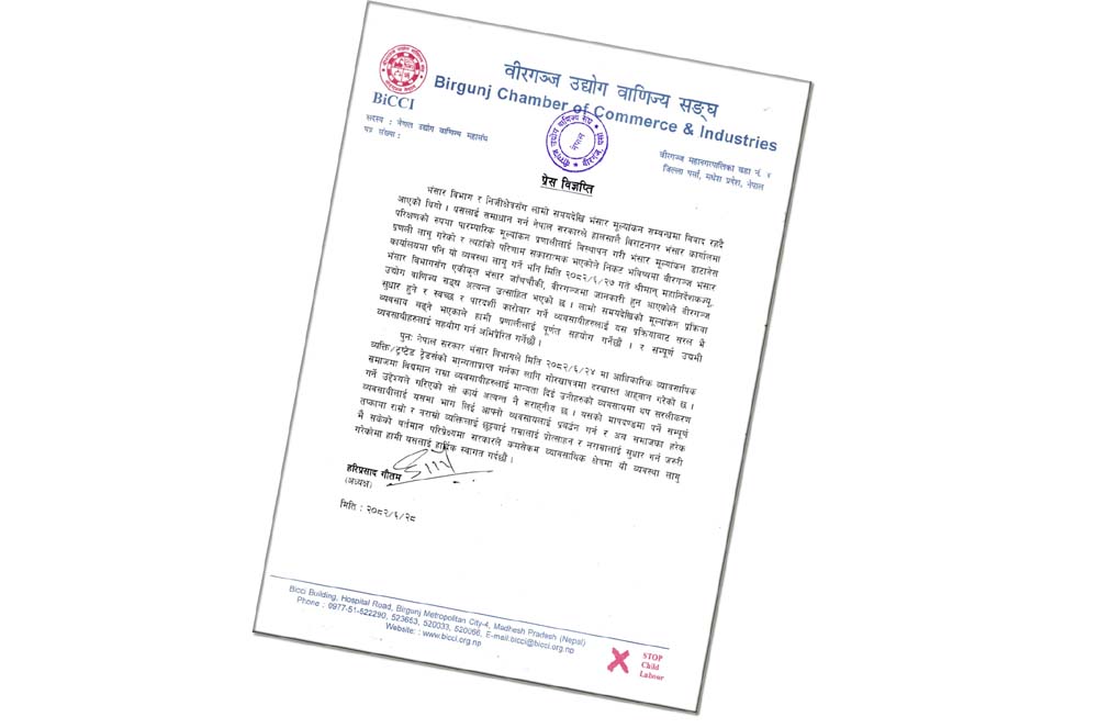 वीरगंज, २८ असोज । वीरगंज उद्योग वाणिज्य संघले मंगलवार प्रेस विज्ञप्ति जारी गर्दै भंसार मूल्यांकन डाटावेस प्रणालीको स्वागत गरेको छ ।